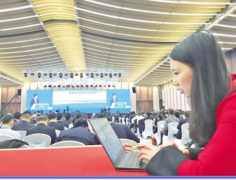 在首届进博会中央企业国际合作论坛及13家央企与合作伙伴签约现场,一名记者正在发稿。 胡庆明/cnsphoto