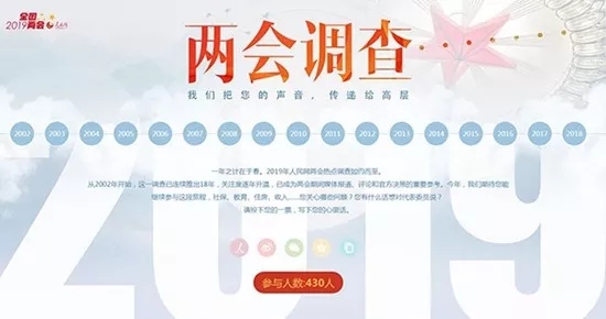 2月12日,人民网推出“两会调查”。本次调查得到了广大网民的积极响应。作为每年全国两会召开前的预热报道,人民网两会调查已连续推出18年。从2月12日至3月1日,2019年的两会调查共吸引450万人次参与,网民参与度再创新高。