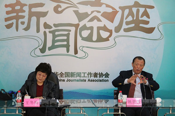 第124期“新闻茶座”主讲嘉宾、国务院参事室特约研究员、原国家统计局总经济师姚景源(右) 李浩 摄