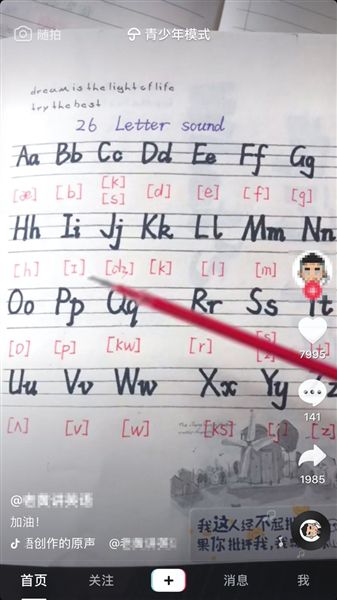 在“青少年模式”下,抖音推荐多为书法、绘画、音乐、英语、数学、物理等教学课程。相较之下,快手的推荐内容更为庞杂,除教学类视频外,还有萌宠、运动、风景视频等。此外,该模式下抖音无法浏览已关注或好友的内容,快手则无此限制。