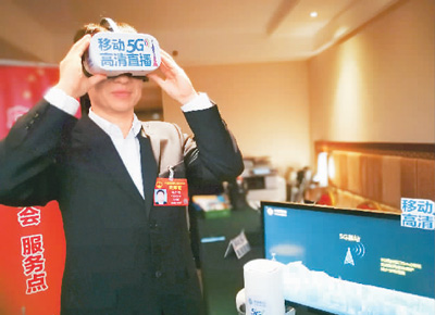 图为代表在用VR设备,体验5G传输的超高速。记者 贺林平摄