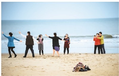 在海南万宁市石梅湾的海边,游客们一边玩耍一边拍抖音。资料图片