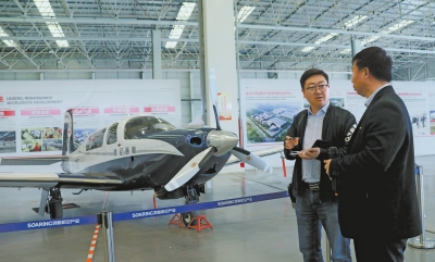 记者冯刘克(左)采访郑州通用航空产业发展