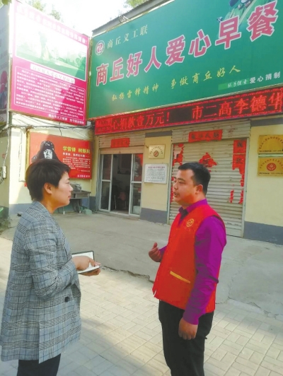 记者李燕(左)采访商丘好人爱心早餐点