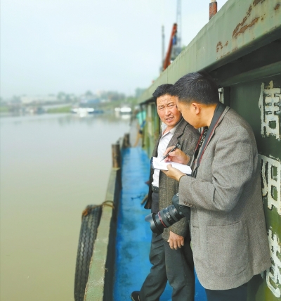记者尹小剑(右)在淮滨饮马港码头采访船民喻忠宝