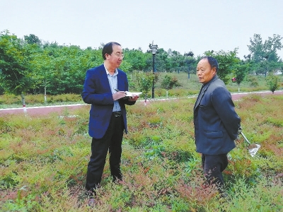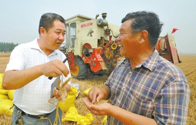 记者杨远高(左)在兰考县采访小麦育种专家沈天民