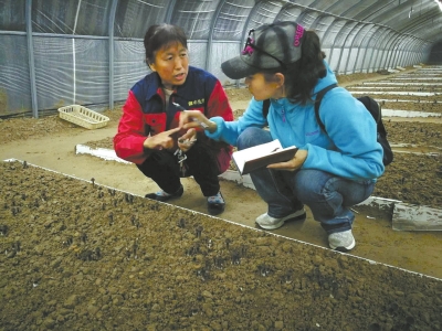 记者赵川(右)在清丰县采访菇农