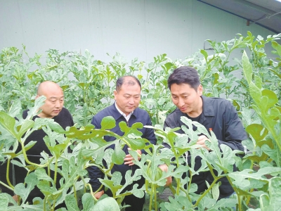 记者冯佳志(中)在修武县五里源乡南庄村绿园彩虹西瓜种植大棚采访乡干部薛朕方