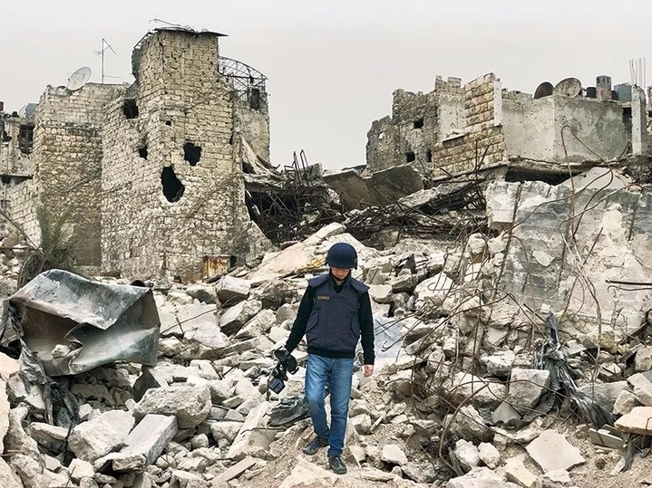 2017年12月22日,新华社记者在叙利亚阿勒颇市区战争造成的废墟中采访。 新华社记者 胡马姆 摄