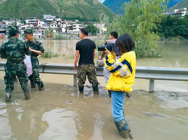 2018年7月15日,新华社记者在遭受强降雨袭击、造成重大山体滑坡险情的甘肃舟曲县江顶崖采访。 新华社记者 张钦 摄