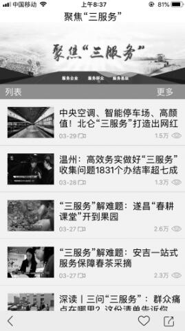 如中国蓝新闻客户端和新蓝网于3月29日同步推出的《中央空调、智能停车场、高颜值!北仑“三服务”打造出网红菜市场》用抖音短视频的形式,介绍了大港菜市场在宁波市北仑区商务、农林、城管、街道等各相关部门通力合作下开业的盛况;3月28日推出《温州:高效务实做好“三服务” 收集问题1831个 办结率超七成》,讲述温州聚焦洞头区兴屿蟹虾养殖基地关于水质检测及育苗难度大、鹿城区恒伟鞋材公司员工子女入学难等问题,以及当地政府实事求是、排忧解难的成果,自“三服务”开展以来,温州搜集问题1831个,解决1303个,全力助推经济高质量发展。