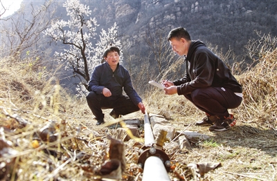 天津日报记者陈忠权(右)实地采访蓟州区常州村山林灌溉情况。