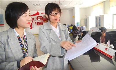 天津日报记者杜洋洋(左)在西青区张家窝镇家贤里社区采访党支部书记兼居委会主任。