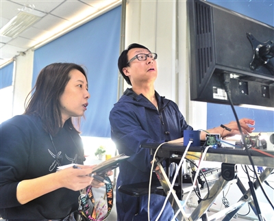 天津日报记者廖晨霞(左)在华来科技蹲点,采访研发维护团队的工程师。