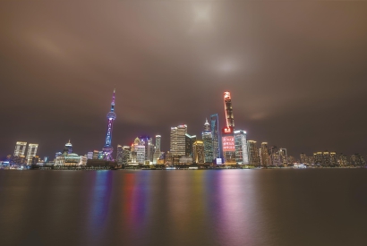 浦东黄浦江畔的震旦大厦上亮起了“解放日报创刊70年”的庆贺字样,格外璀璨。 记者 孟雨涵 摄