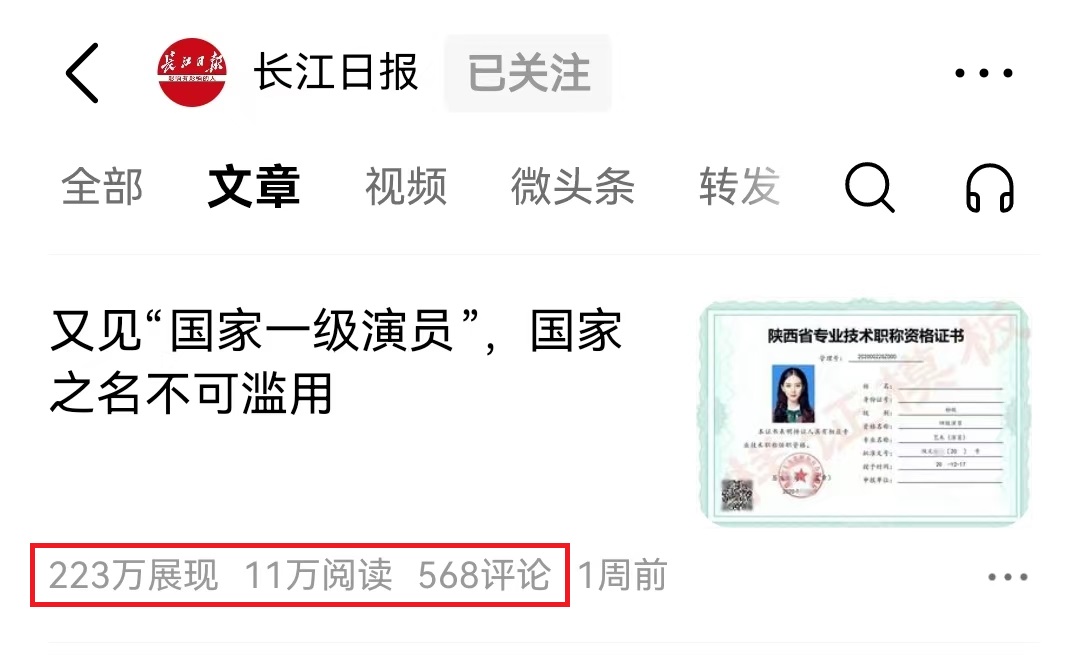 2月9日,长江日报大武汉客户端刊发的《又见“国家一级演员”,国家之名不可滥用》一文引发广泛社会关注,“中国晚协”公众号、中国江西网、中国宁波网、西安新闻网、湖南广播电视台都市频道“芒果都市”公众号、“编采圈”公众号等转发。