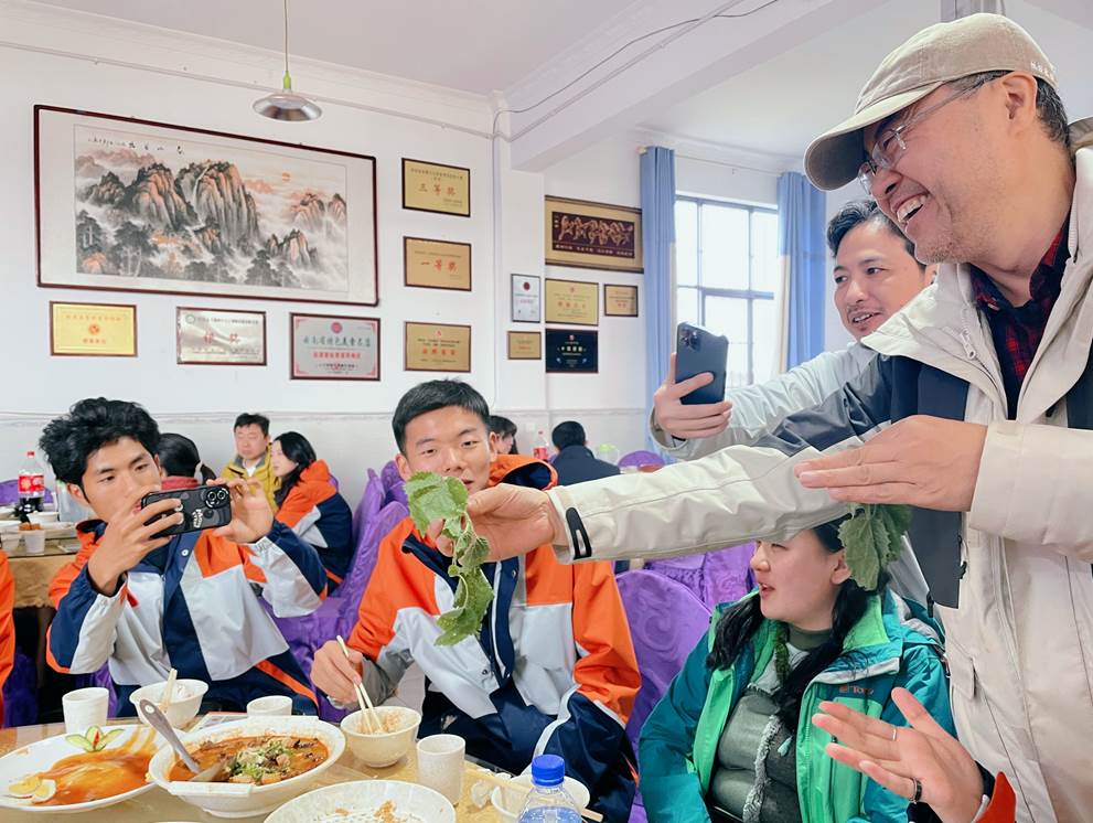 博物学家刘华杰教授(右一)一路上在山野、田间和餐桌上做博物科普,介绍云南的生物多样性及本土物种保护。图为刘教授从后厨找来餐桌上的野菜——“蜇人”的荨麻