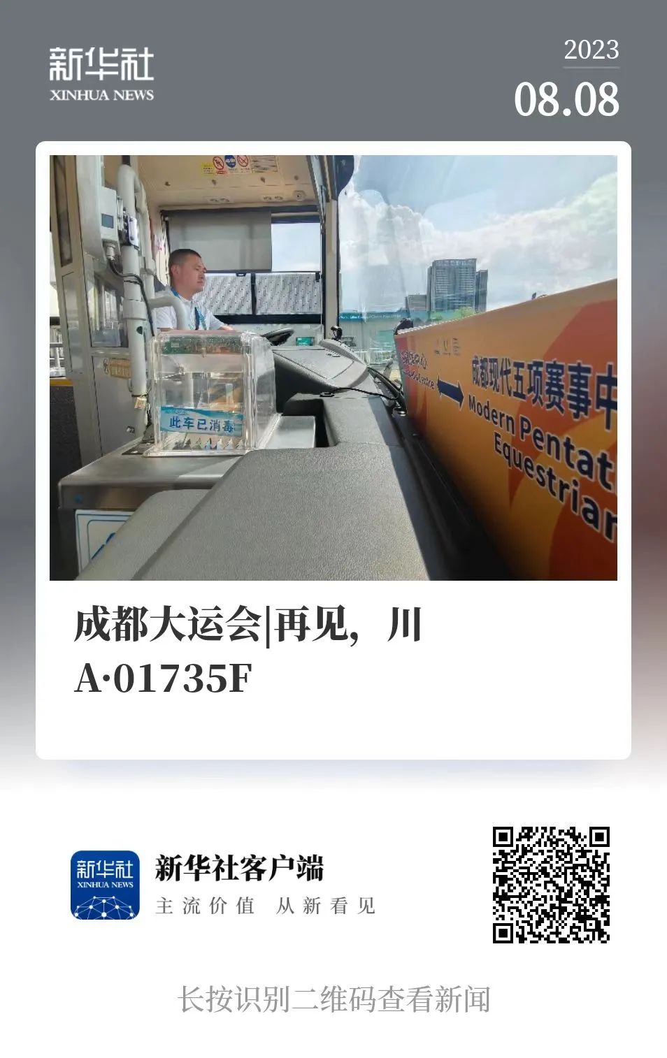 《再见,川A·01735F》以一辆成都大运会媒体班车为主线,讲述公交车司机陈安亮在赛事最后一天完成最后一个出车任务的过程。他在车内整理座位、拍照留念,还计划未来以乘客身份重坐这辆车。赛事期间,尽管长时间离家,且需每日接受酒精检测和车辆检查,他仍为能参与大运会而自豪。像他这样,为赛事媒体交通服务的共有402名驾驶员、347台车。陈安亮的这段讲述,用丰富的描写、细节的穿插以及记者多日乘坐这一班车所夹杂的不舍之情,以小见大地展现了普通劳动者的付出与情怀。