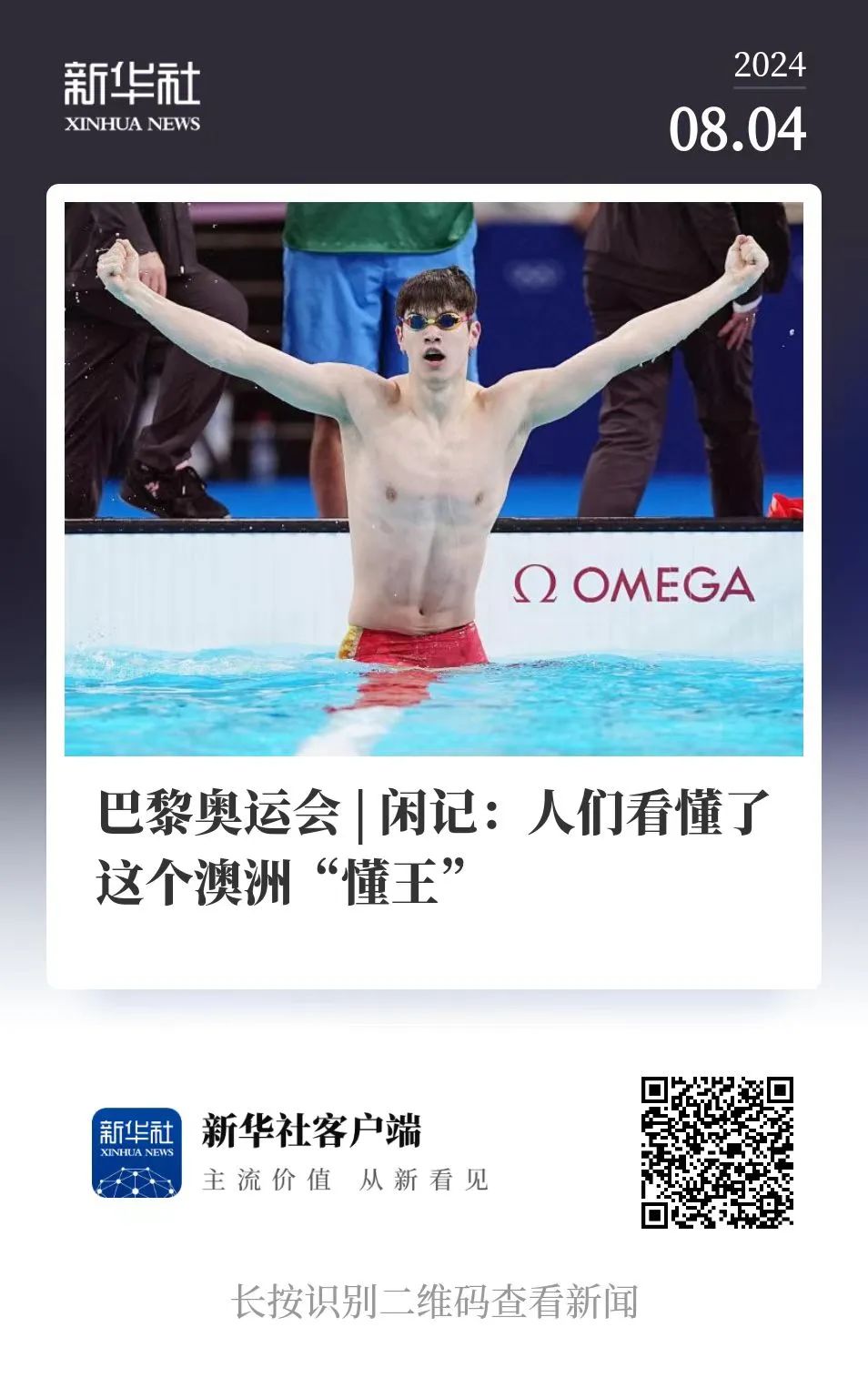 巴黎奥运会期间,中国游泳队遭遇了美西方关于兴奋剂问题的无端质疑。中国选手潘展乐以打破世界纪录的成绩赢得巴黎奥运会男子100米自由泳金牌后,澳大利亚教练布莱特·霍克,通过社交媒体发表了一段视频质疑潘展乐的表现。西方媒体看到这段视频后,如获至宝,纷纷引用霍克的话作为攻击中国游泳选手的证据,形成了新一轮谣言旋风。