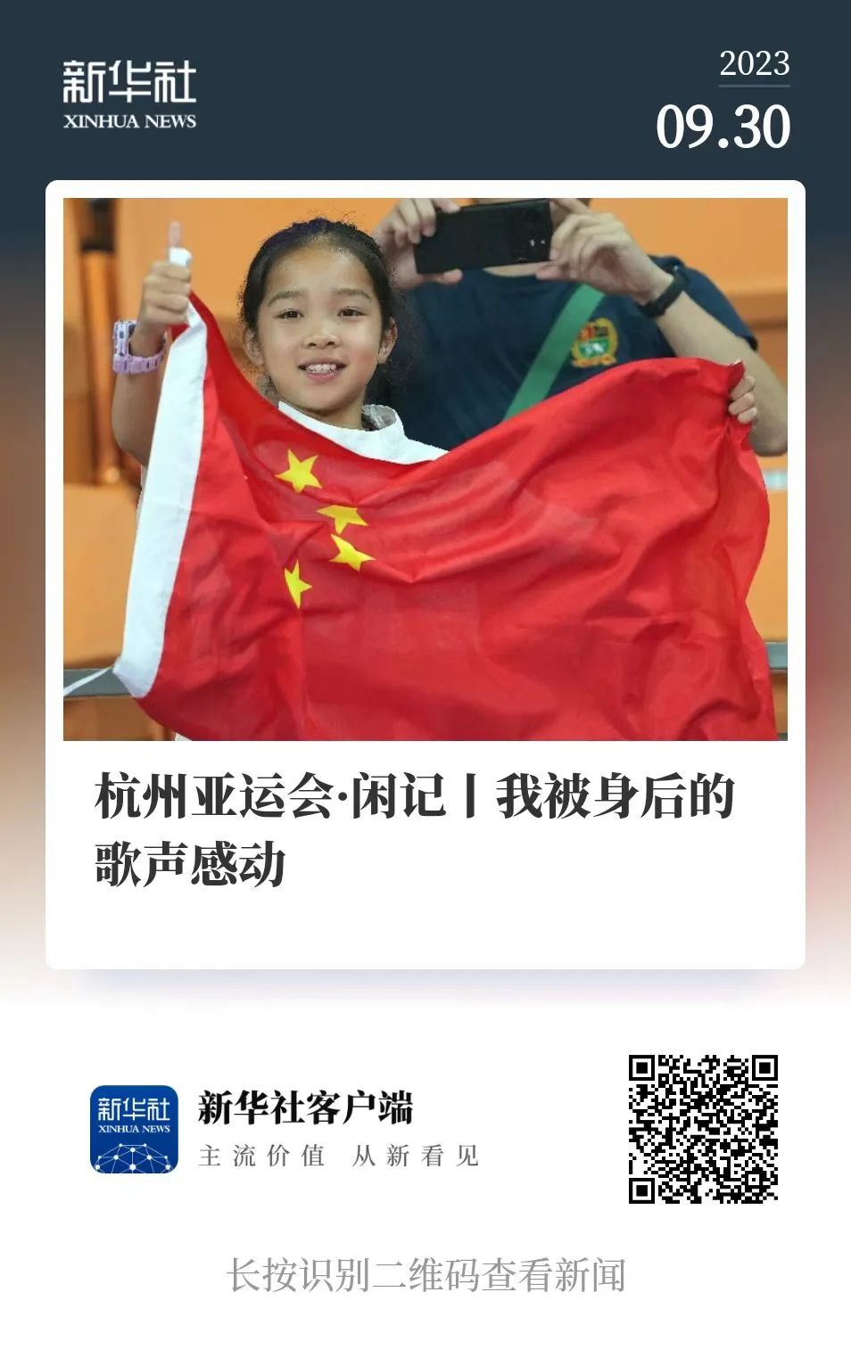 中国队在当天收获3枚金牌,国歌奏响时,这位小女孩昂首挺胸、专注歌唱,即便现场音响声覆盖全场,她的声音依然清晰可闻。《我被身后的歌声感动》这篇“闲记”,以个体的温情瞬间为切入点,反映了杭州亚运会上普通民众与国家荣誉之间的情感共鸣。当时恰巧是国庆节前夕,体育盛会与爱国情怀通过这件小事而呈现。