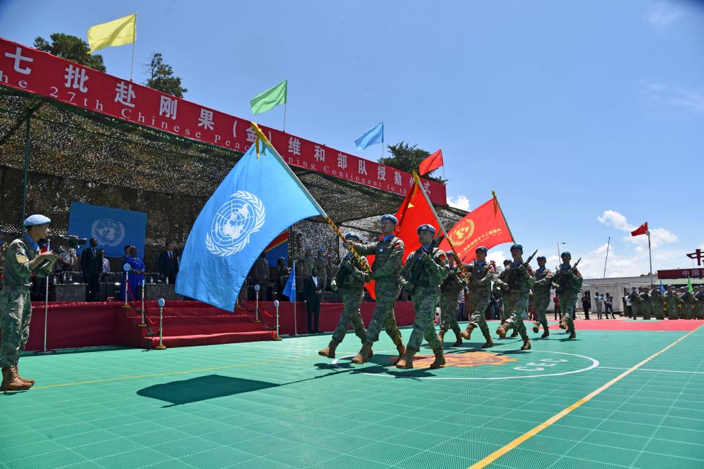 2024年4月9日,在刚果(金)南基伍省布卡武市的中国半岛营区,中国第27批赴刚果(金)维和部队官兵被授予联合国“和平勋章”。新华社发