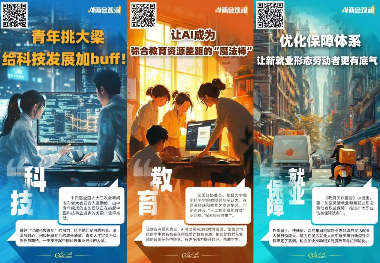 用新技术助力表达年轻化,让呈现形式更丰富。光明日报着重思考应如何借助AI技术,用年轻群体易于接受的方式进行两会宣传报道,为了将年轻人的目光吸引到对国家大政方针的关注上来,《AI海报之两会观澜》专栏的《青年挑大梁,给科技发展加buff!》《让AI成为弥合教育资源差距的“魔法棒”》《优化保障体系,让新就业形态劳动者更有底气》《破除“心病”隐痛,让心理门诊成为社会标配服务》等作品,均是在深入了解年轻群体关注的话题后策划推出,而文字+漫画方式的采用,也是希望借助AI强大的绘画功能打造出让年轻人赏心悦目的呈现方式。在《小艺看两会》短视频评论节目中,之所以将AI主播“小艺”引入,其重要原因就是其亲切自然的口吻可让青年群体感受到平等交流的态度,同时为节目增添了科技感,用新奇、多元、酷炫的外壳吸引年轻群体对两会重要议题的关注。