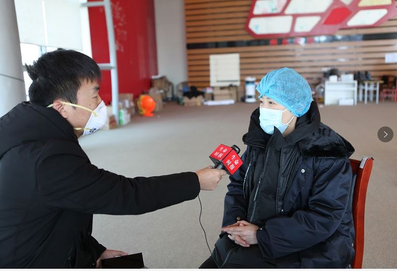 2月16日,人民日报社《生命时报》记者张健采访武汉国博方舱医院护理部负责人吴兰护士长。