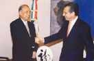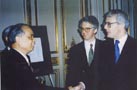 乔石向随行的新华社记者龙文明祝贺六十诞辰
