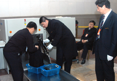工作人员为记者进行安检