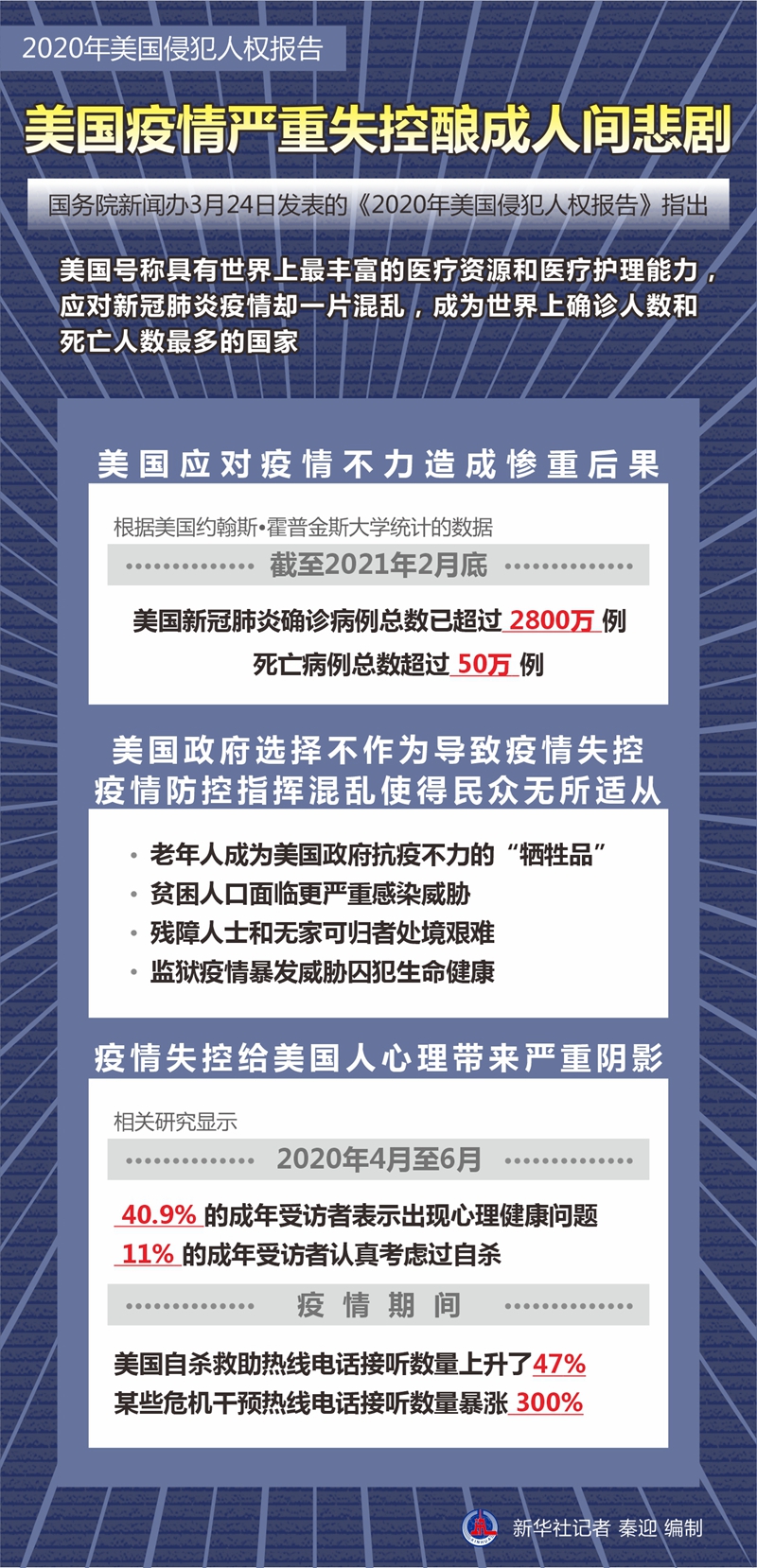 报告指出,美国应对疫情不力造成惨重后果。根据美国约翰斯·霍普金斯大学统计的数据,截至2021年2月底,美国新冠肺炎确诊病例总数已超过2800万例,死亡病例总数超过50万例。