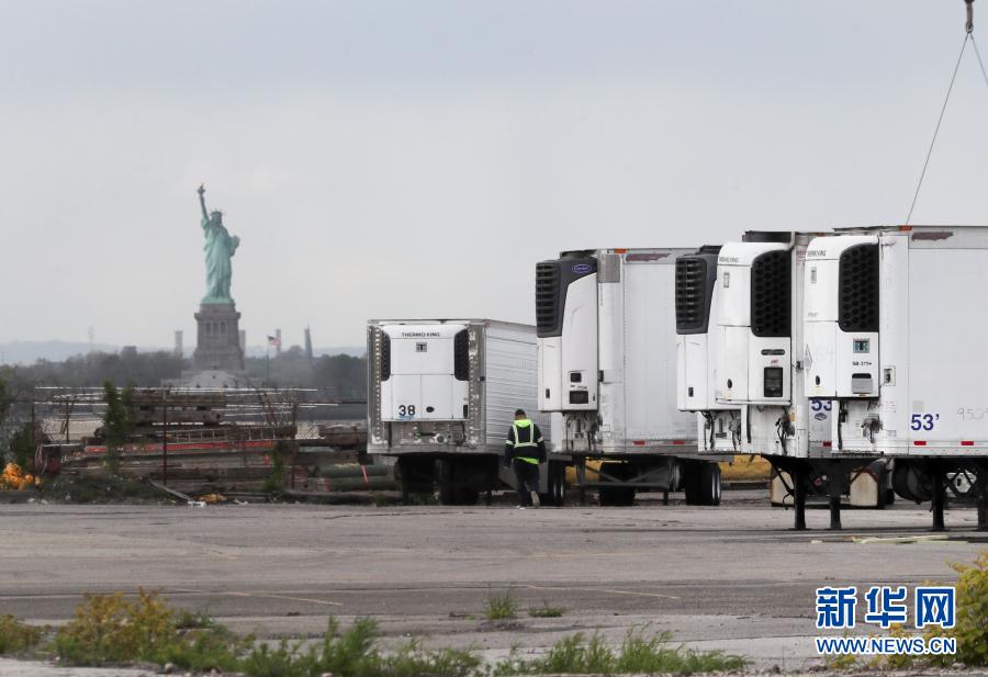 2020年5月11日,冷藏拖车停放在美国纽约布鲁克林的临时停尸场所内。由于死亡病例激增导致停尸房已满,当地一些医院只能找冷藏车保存病患遗体。新华社记者 王迎 摄