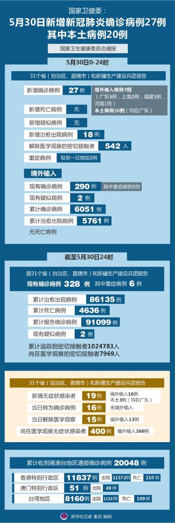 新华社北京5月31日电 国家卫健委31日通报,5月30日0-24时,31个省(自治区、直辖市)和新疆生产建设兵团报告新增新冠肺炎确诊病例27例,其中境外输入病例7例(广东3例,上海2例,福建1例,河南1例),本土病例20例(均在广东);无新增死亡病例;无新增疑似病例。
