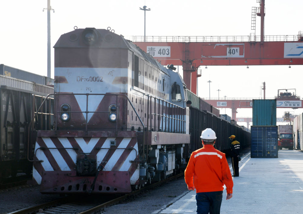 一列搭载日韩轮胎、汽车配件、电子元件等货物的“齐鲁号”中亚班列即将发车驶出位于青岛的中国-上合组织地方经贸合作示范区青岛多式联运中心(2020年11月9日摄)。新华社记者 李紫恒 摄