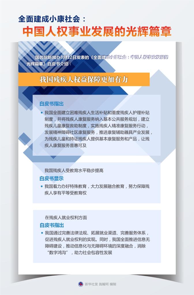 新华社北京8月12日电 国务院新闻办公室12日发表的《全面建成小康社会:中国人权事业发展的光辉篇章》白皮书介绍,我国残疾人权益保障更加有力。