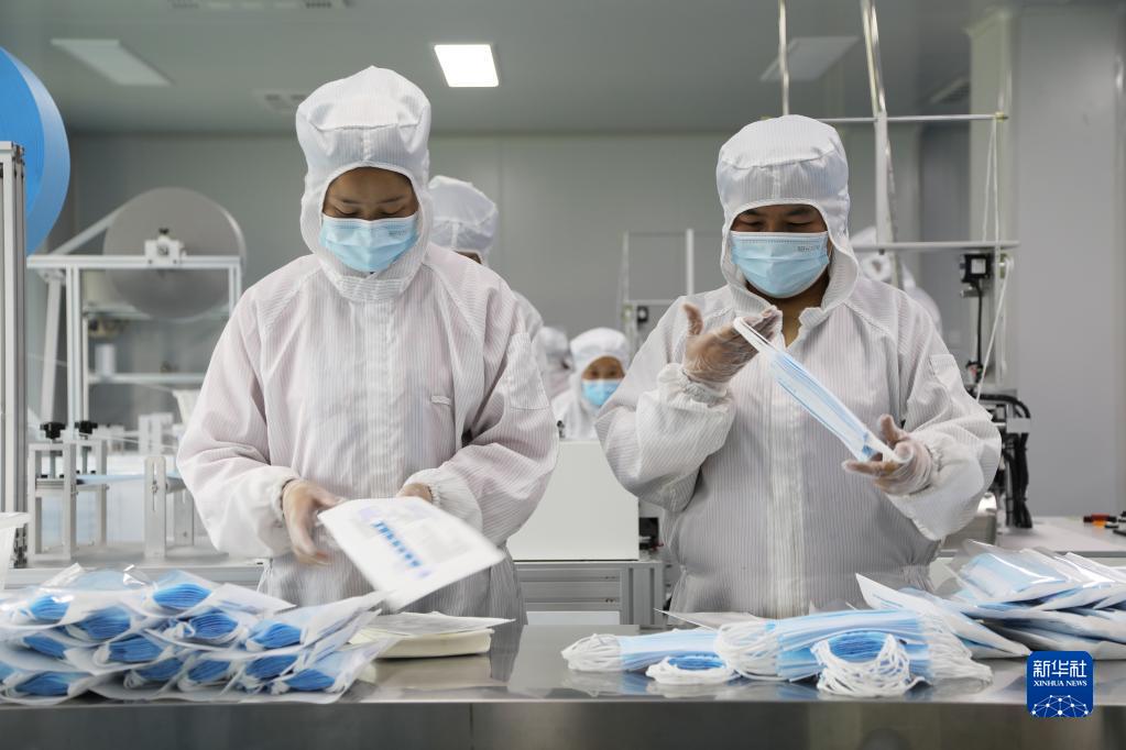 3月26日,在甘肃省临夏市南龙镇马家庄村的甘肃阳光智家网络科技有限公司医用口罩生产车间内,工作人员在加工生产医用口罩。2021年初,该公司与另外一家材料科技企业联合研发的石墨烯口罩实现批量生产。新华社记者 马莎 摄