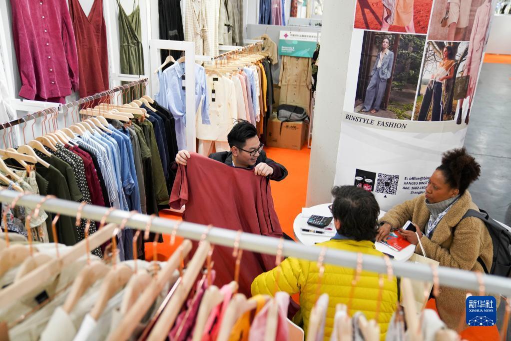 2020年1月21日,在美国纽约举行的第二十一届中国纺织品服装贸易展览会(纽约)春季展上,江苏一家企业的工作人员(左)为访客介绍产品。新华社记者 王迎 摄