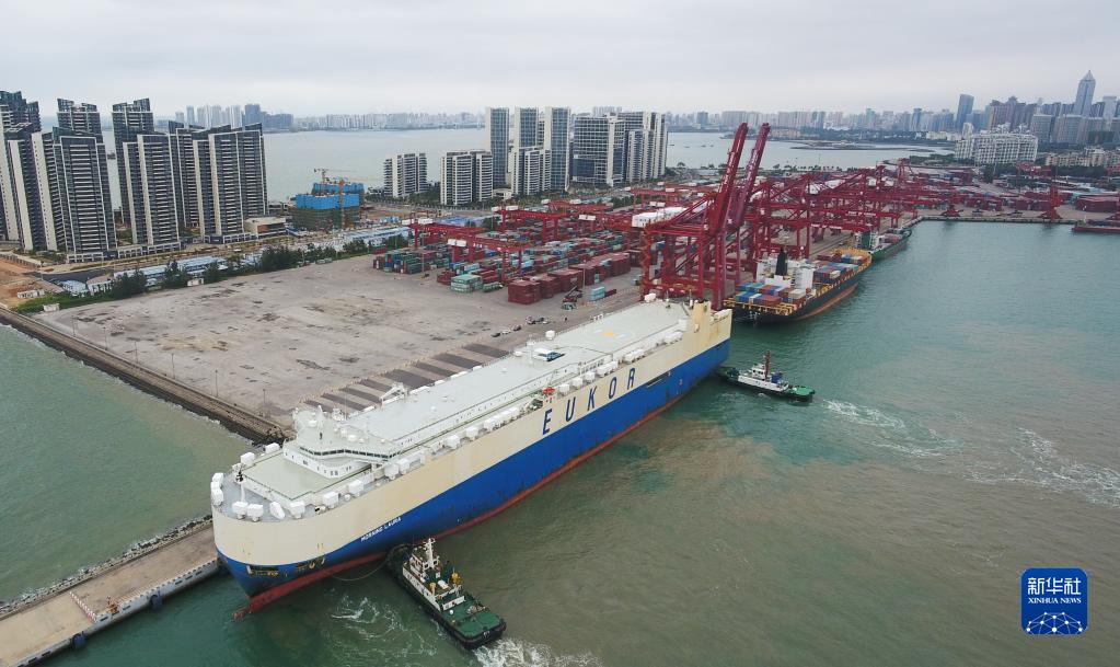 2020年2月16日,滚装货船“劳拉”轮驶入海口秀英港(无人机照片)。这是海南自贸区政策实施后的首艘汽车外贸船。新华社记者 杨冠宇 摄