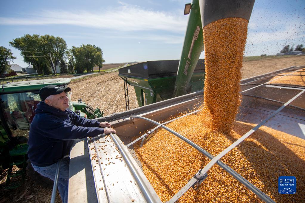 2019年10月14日,在美国艾奥瓦州大西洋镇,比尔·佩雷特看着收获的玉米装上卡车。新华社记者 王迎 摄