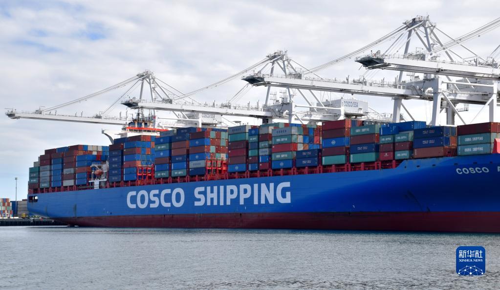 这是2019年2月27日在长滩港拍摄的一艘中国远洋运输集团(COSCO)的集装箱货轮。新华社记者 李颖 摄