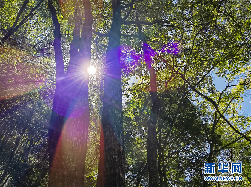 阴条岭自然保护区植物茂盛,中午时分阳光透过森林缝隙,画面唯美。新华网发(王强 摄)