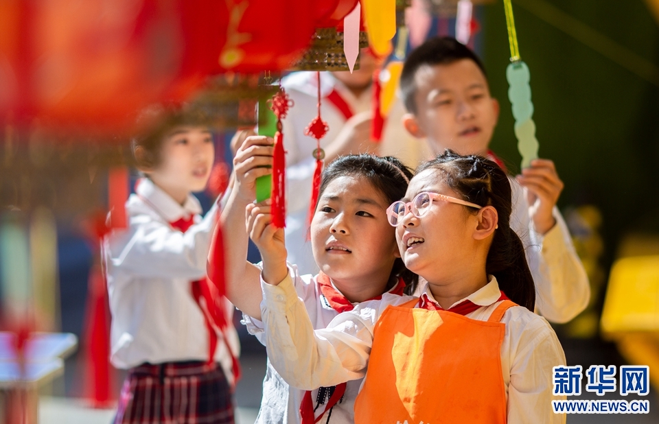 9月7日,呼和浩特市玉泉区恒昌店巷小学学生在猜灯谜。新华网 发(丁根厚 摄)