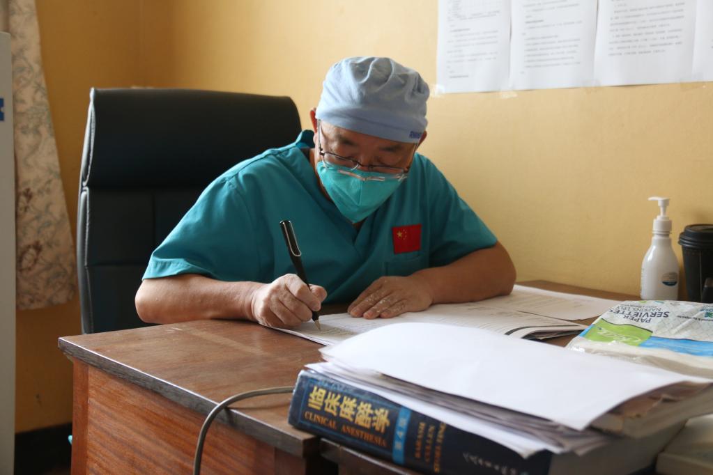9月22日,在卢旺达东方省基本戈医院,中国第22批援卢旺达医疗队队员李俊升为患者写病历。新华社发(黄万晴摄)