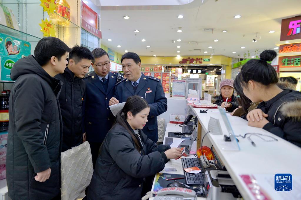 河北宁晋县纪检干部与税务稽查人员在当地一家超市检查是否有单位公款购买购物卡情况(2018年12月29日摄)。新华社记者 牟宇 摄