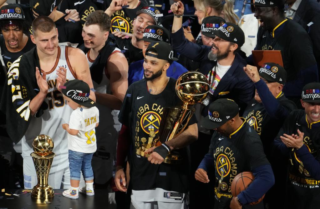 新华社华盛顿6月12日电 在12日进行的2022-2023赛季美职篮(NBA)总决赛第五场比赛中,约基奇和小波特携手率领丹佛掘金队逆转迈阿密热火队,主场94:89击败对手,以大比分4:1胜出,获得球队历史上首座总冠军奖杯。掘金队当家球星约基奇毫无悬念地当选总决赛最有价值球员(FMVP)。
