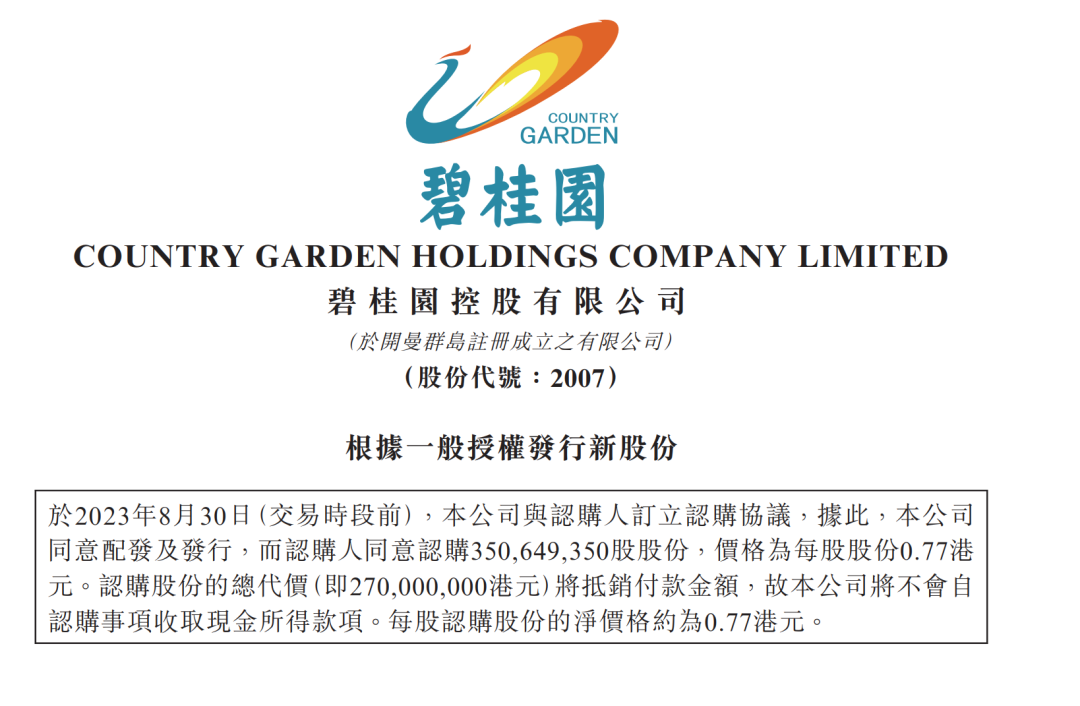 8月30日早间,碧桂园在港交所公告,公司与认购人订立认购协议,将发行3.51亿股新股,发行价格为每股0.77港元,较公司8月29日收市价每股0.91港元折让约15.38%。认购股份的总代价为2.70亿港元。本次发行的股份约为公司现有已发行股本的1.27%,约为发行后公司总股本的1.25%。