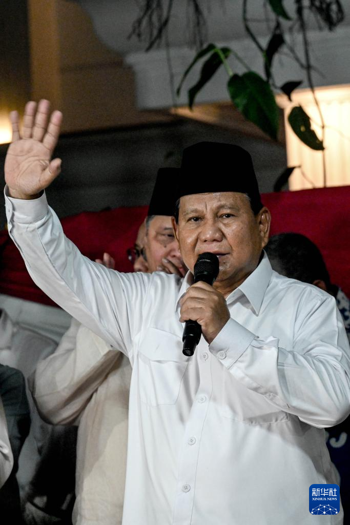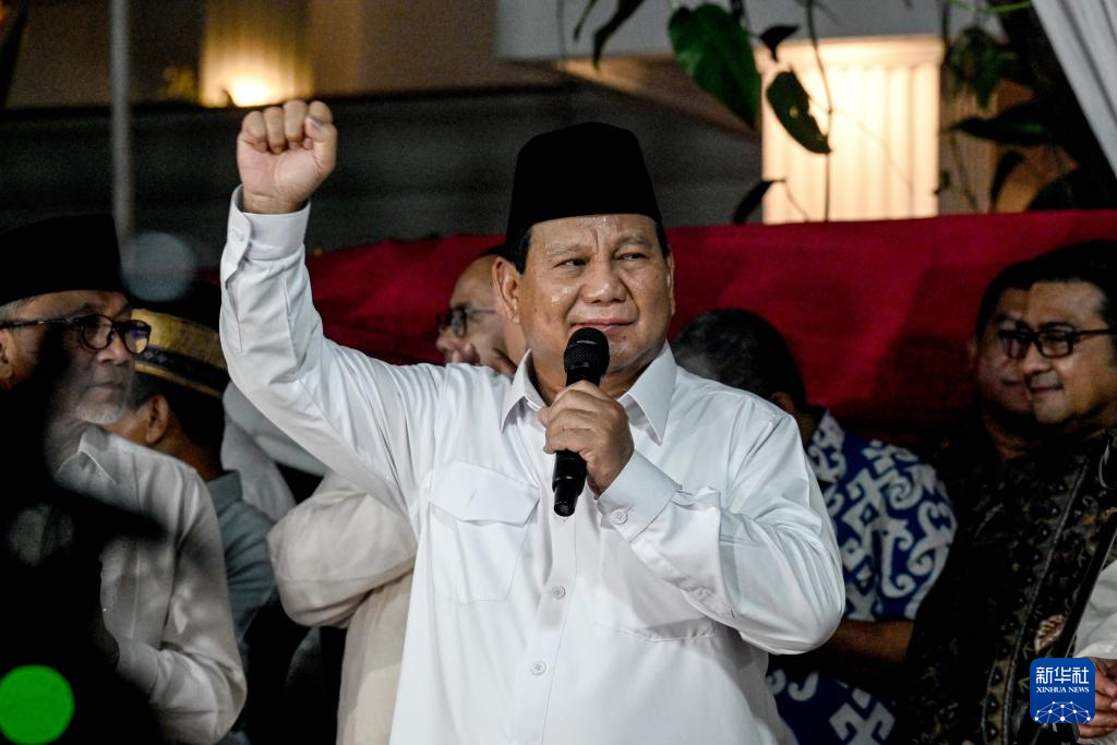 3月20日,在印度尼西亚雅加达,普拉博沃(中)在媒体记者和支持者到场的集会上讲话。新华社发(阿贡摄)