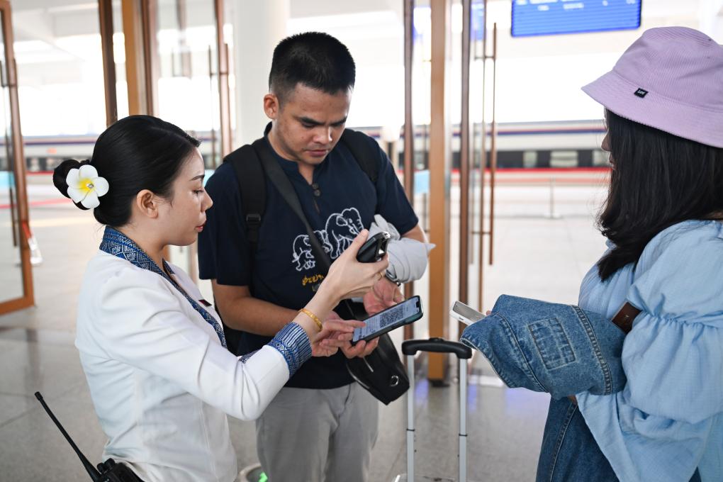 10月12日,在老挝万象中老铁路万象站,工作人员检验乘客车票。新华社记者程一恒摄