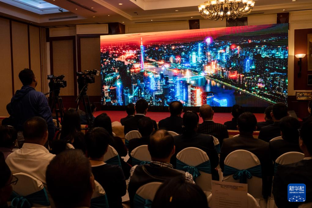 4月15日,在尼泊尔加德满都,嘉宾观看广州城市形象宣传片。新华社发(哈里·马哈尔詹摄)