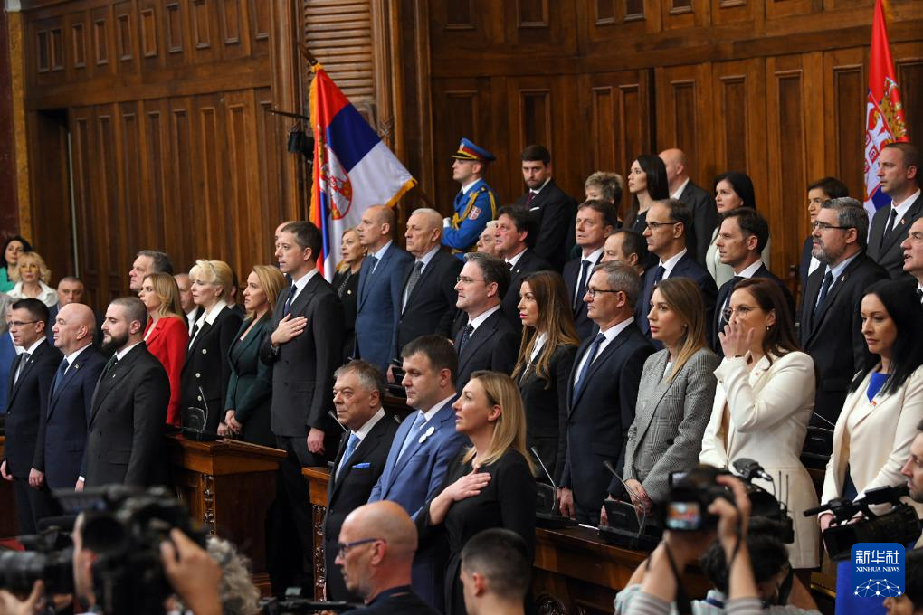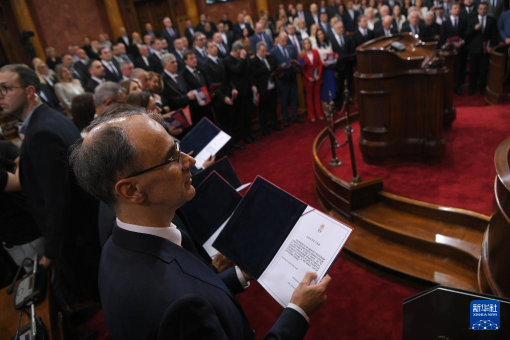 4月16日,塞尔维亚新内阁成员在贝尔格莱德的国民议会宣誓就职。新华社发(普雷德拉格·米洛萨夫列维奇摄)