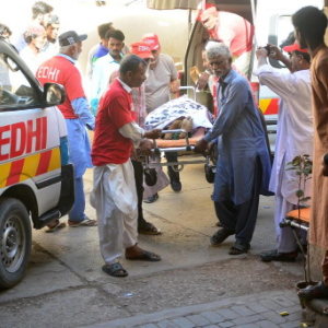 4月22日,在巴基斯坦南部信德省贾姆肖罗地区,救援人员将一名交通事故中遇难者的遗体送到医院。新华社发